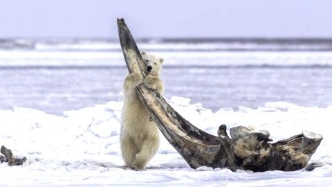 มื้อพิเศษ! หมีขาวแทะกระดูกวาฬยักษ์ หลังมนุษย์ล่าทิ้งไว้ในสหรัฐฯ