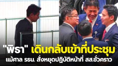 "พิธา" เดินกลับเข้าที่ประชุมสภา แม้ศาล รธน. สั่งหยุดปฏิบัติหน้าที่ สส. ชั่วคราว ปมถือหุ้นสื่อ