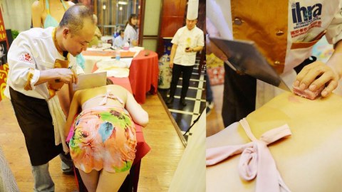 พ่อครัวจีนโชว์ฝีมือหวาดเสียว หั่นเนื้อสัตว์บนหลังสาว