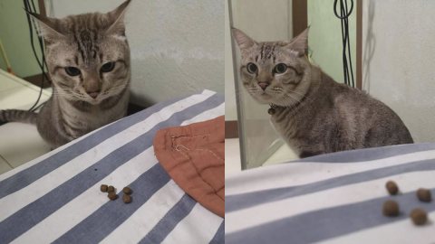 น้องแมวเป็นห่วงทาสสาวที่นอนป่วย จึงคาบอาหารเม็ดมาให้ถึงเตียง เพราะกลัวไม่มีอะไรกิน