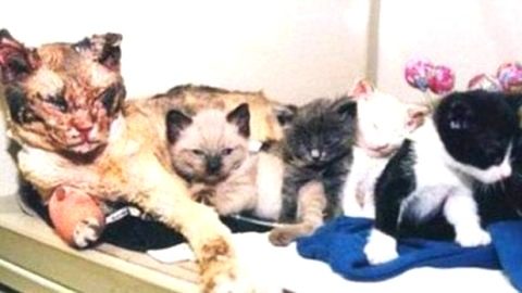 แม่เหมียวผู้กล้าหาญ ลุยไฟเข้าช่วยลูกๆ 5 ตัว