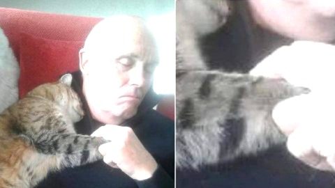 คุณพ่อนอนหลับสนิทเพราะพักฟื้นจากการผ่าตัด และคุณแม่พบว่ามีแมวแปลกหน้านอนกอดเขาอยู่