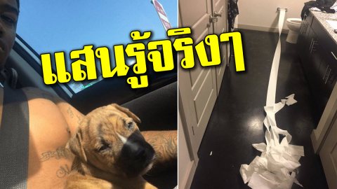 ตูบน้อยกลัวคุณพ่อดุเพราะฉี่ผิดที่ผิดทาง จึงลากกระดาษทิชชู่มาช่วยเช็ดให้ซะเลย