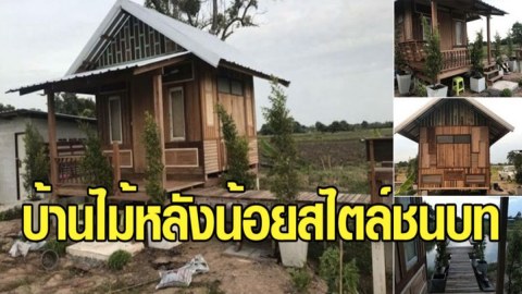 บ้านไม้หลังน้อยสไตล์ชนบทกลางทุ่งนา มีเฉลียง แลสะพานทอดไปบ่อน้ำสวยมาก
