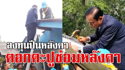 ไม่ธรรมดาจริงๆ !! ลุงตู่ลงทุนปีนหลังคา ตอกตะปูซ่อมหลังคาบ้านให้ ชาวบ้าน
