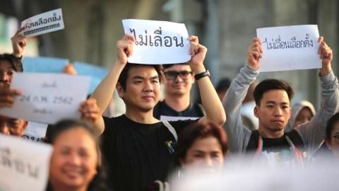 "ปิยบุตร" รุดให้กำลังใจผู้ชุมนุมชูป้าย “ไม่เลื่อน” เลือกตั้ง
