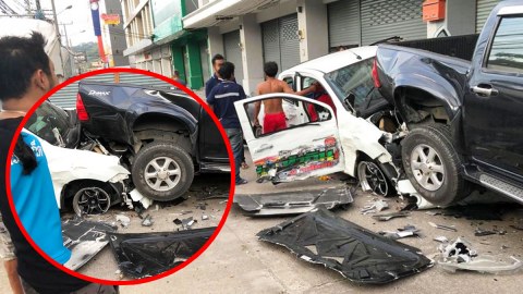 กระบะเสยเก๋ง ก่อนพุ่งชนรถข้างทางยับ (มีคลิป)