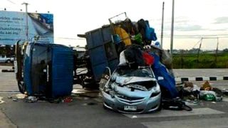ชนสนั่นกลางแยก!! สาวซิ่งเก๋งเสยรถขยะ เทกระจาดเหม็นคลุ้งทั่วถนน!