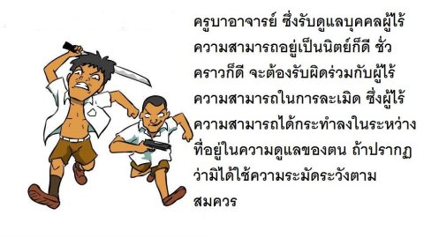 นักเรียนผู้เยาว์ไปทำก่อให้เกิดความเสียหายกับผู้ใดในระหว่างอยู่ในความดูแลของครูบาอาจารย์อาจารย์นั้นย่อมต้องร่วมรับผิดในผลแห่งละเมิดนั้นด้วย